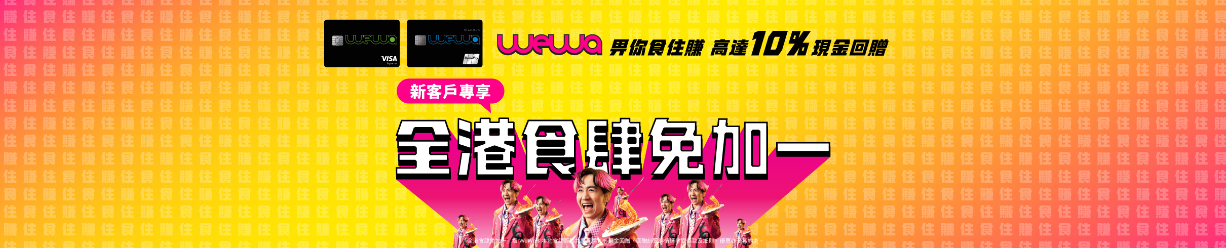 由2026年1月1日至31日,WeWa信用卡新客戶除咗迎新優惠外,用WeWa卡喺本地餐飲簽賬,無須登記,食住賺高達10%現金回贈,等於幫你免加一!