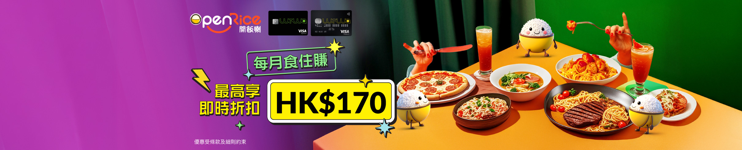 於2026年1月1日上午12時正至2026年2月28日下午11時59分期間,憑WeWa Visa信用卡於OpenRice(包括手機應用程式及網站)購買餐飲券及訂購外賣自取,每月可享高達HK$170即時折扣優惠!