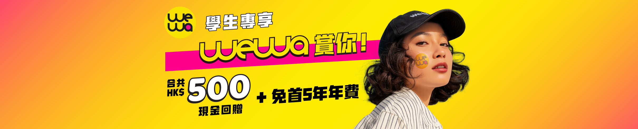指定全日制大學/大專學生1經此網頁成功申請WeWa信用卡,除可獲免首5年年費外,仲可享迎新優惠HK$200現金回贈!!經WeWa信用卡網頁成功申請,更可享額外HK$300回贈(免簽賬),合共賺高達HK$500現金回贈!申請更免入息證明,畀你盡情享受大學生活!