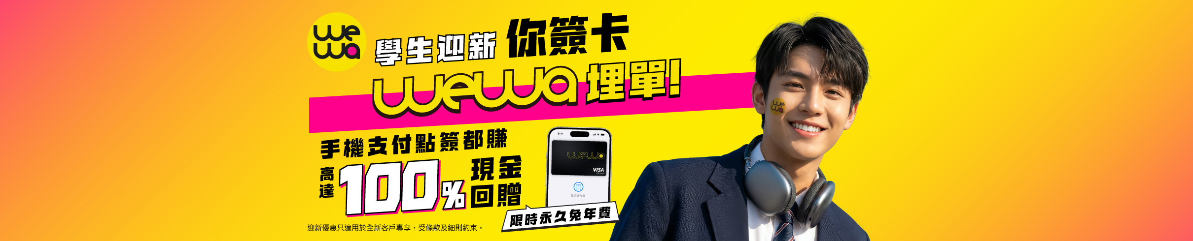 由即日起至2026年2月28日,指定全日制大學/大專學生兼全新客戶經此網頁成功申請WeWa信用卡,憑卡在發卡後首90日以指定手機支付簽賬消費即賺高達100%現金回贈。